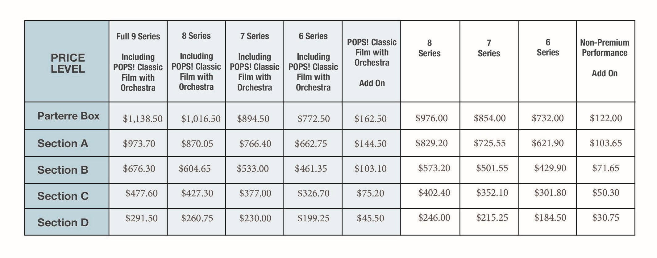 Please note: Subscriptions are not sold on Box Tier (Floor 2) or Balcony (Floor 5). Those floors are available at a later date for single ticket sales only.